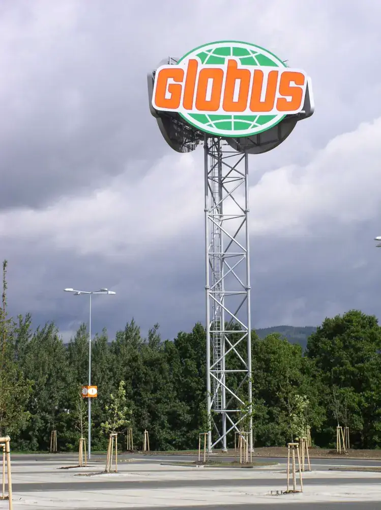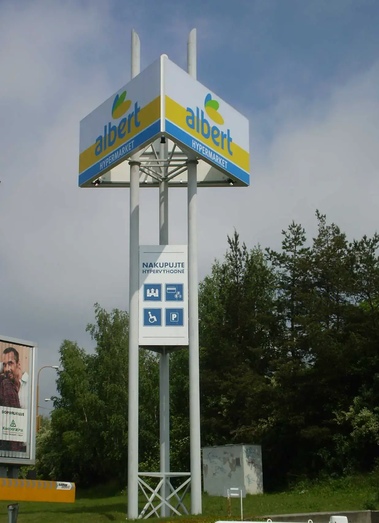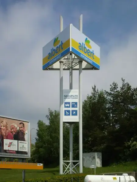 - Umístění: označování hypermarketů, obchodních center, sídel firem a čerpacích stanic. Pro kotvení je nutný betonový základ dle statického posudku. Pro lepší bezpečnost a servis lze přidat servisní lávky.